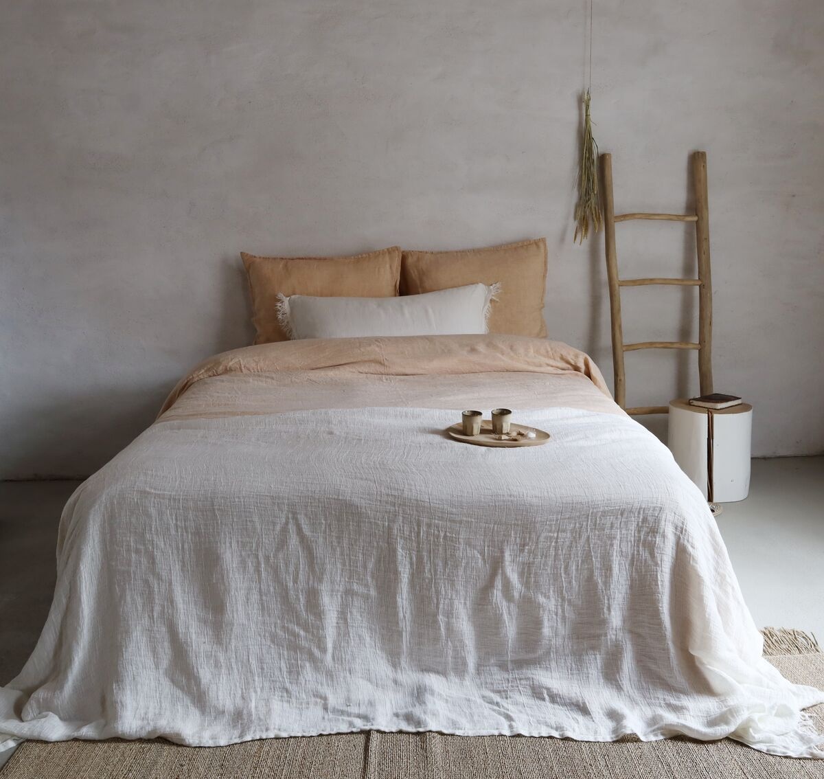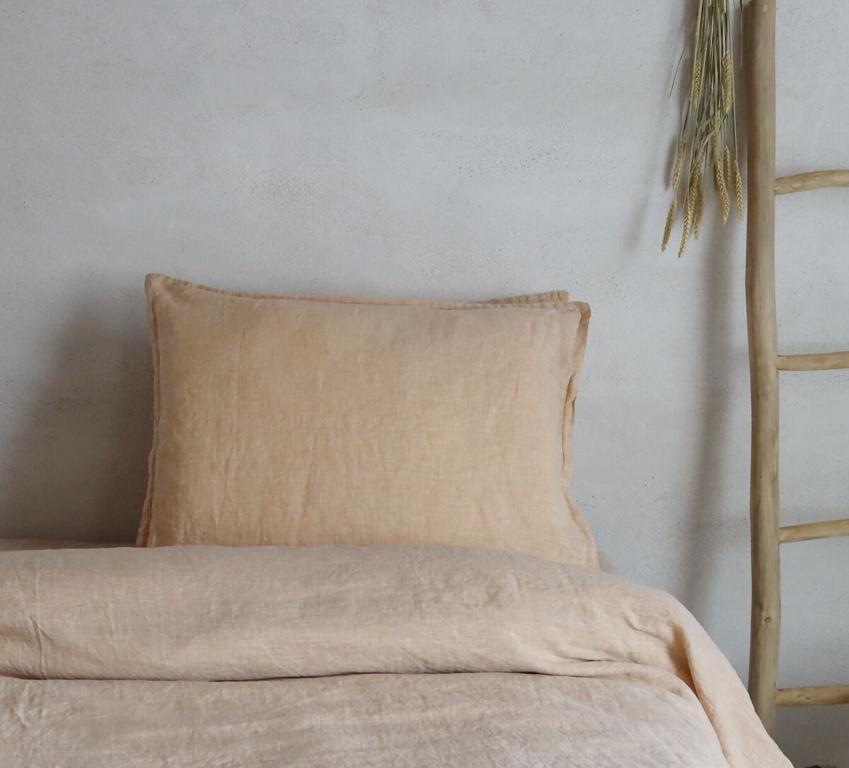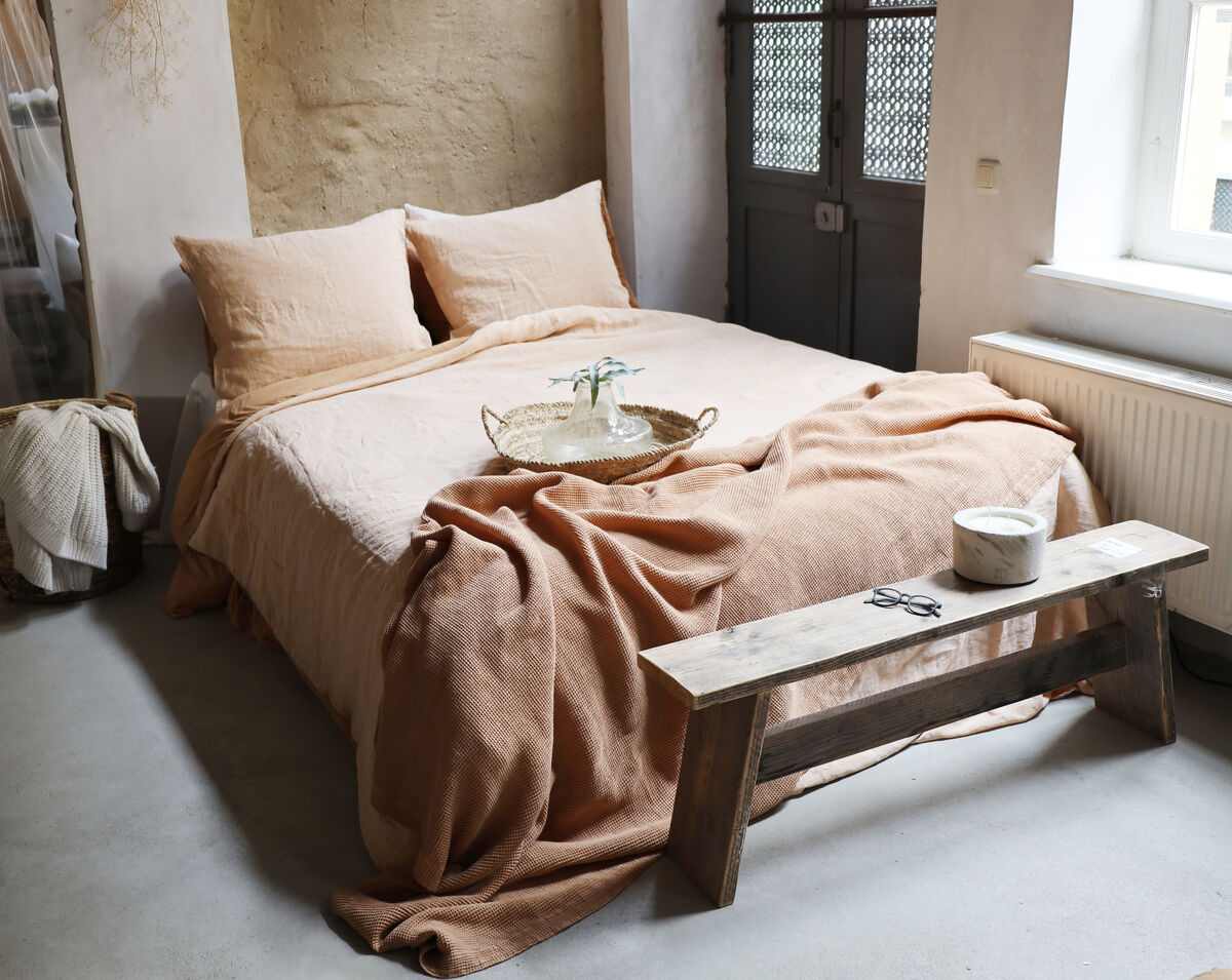 La nouvelle housse de couette Claire de couleur cognac ou sand a un recto en chambray de lin et un verso en coton percal de couleur cognac. Le chambray est un lin mélangé, tissé avec deux couleurs de fils. Cela donne un bel aspect naturel aux fils bicolores. Le verso des couettes Claire est de couleur unie, assortie au recto. Vous pouvez donc les utiliser des deux côtés ! Veuillez noter que vous pouvez choisir entre des housses de couette avec et sans taies d'oreiller.