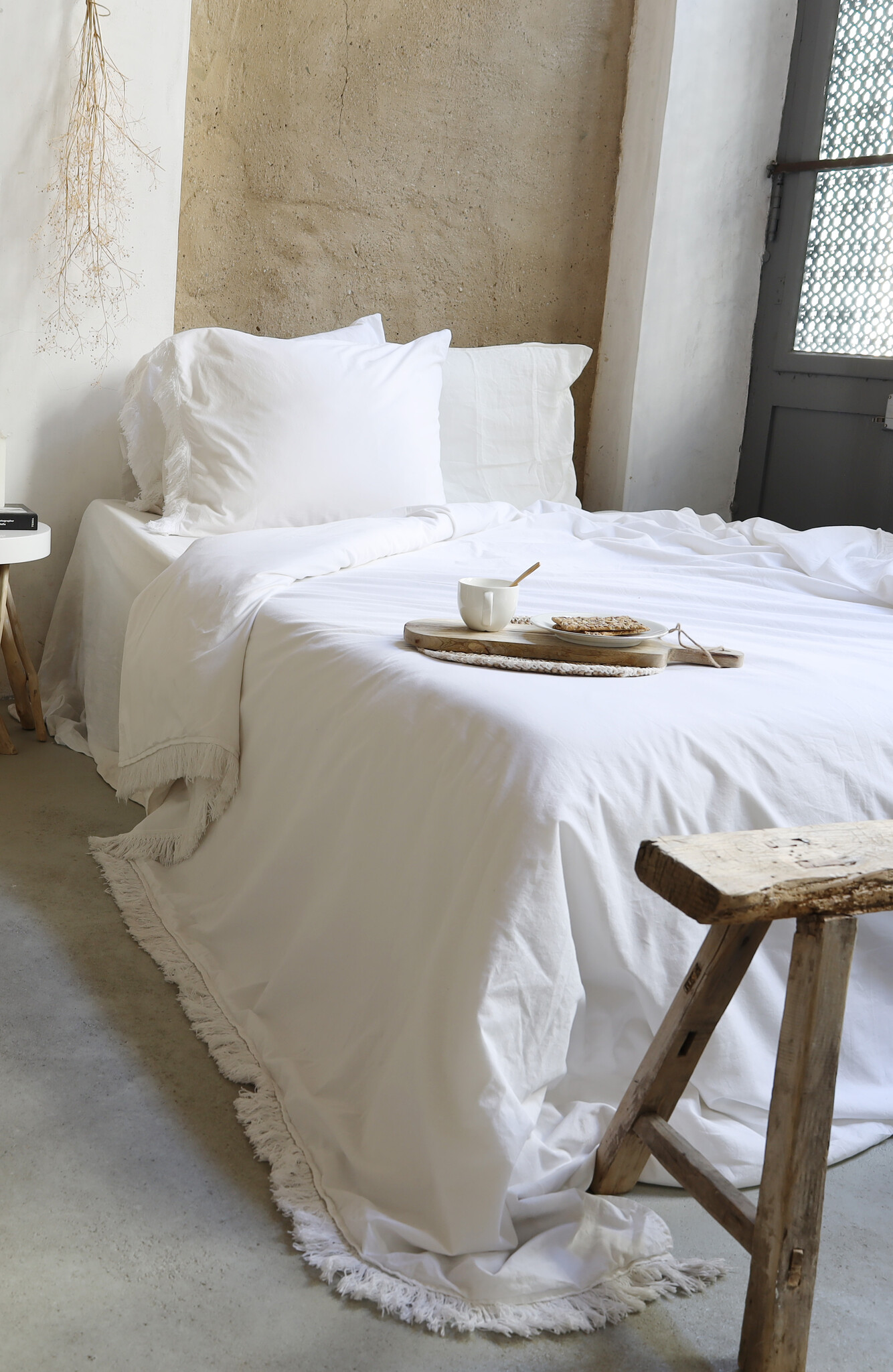 Apportez une ambiance estivale et décontractée à la chambre avec cette housse de couette et sa taie assortie. La bordure à franges ajoute une touche bohème subtile, tandis que le coton doux garantit un confort optimal.