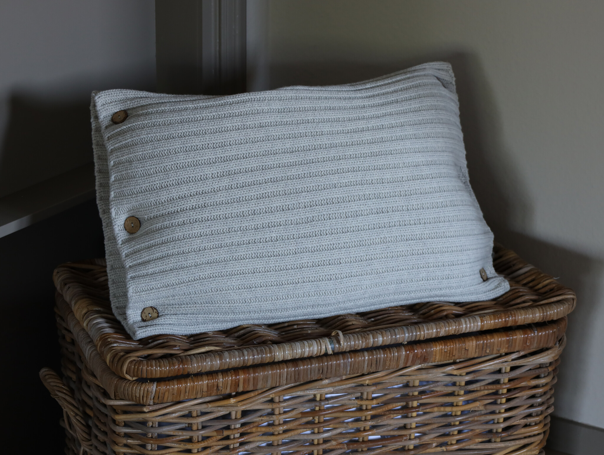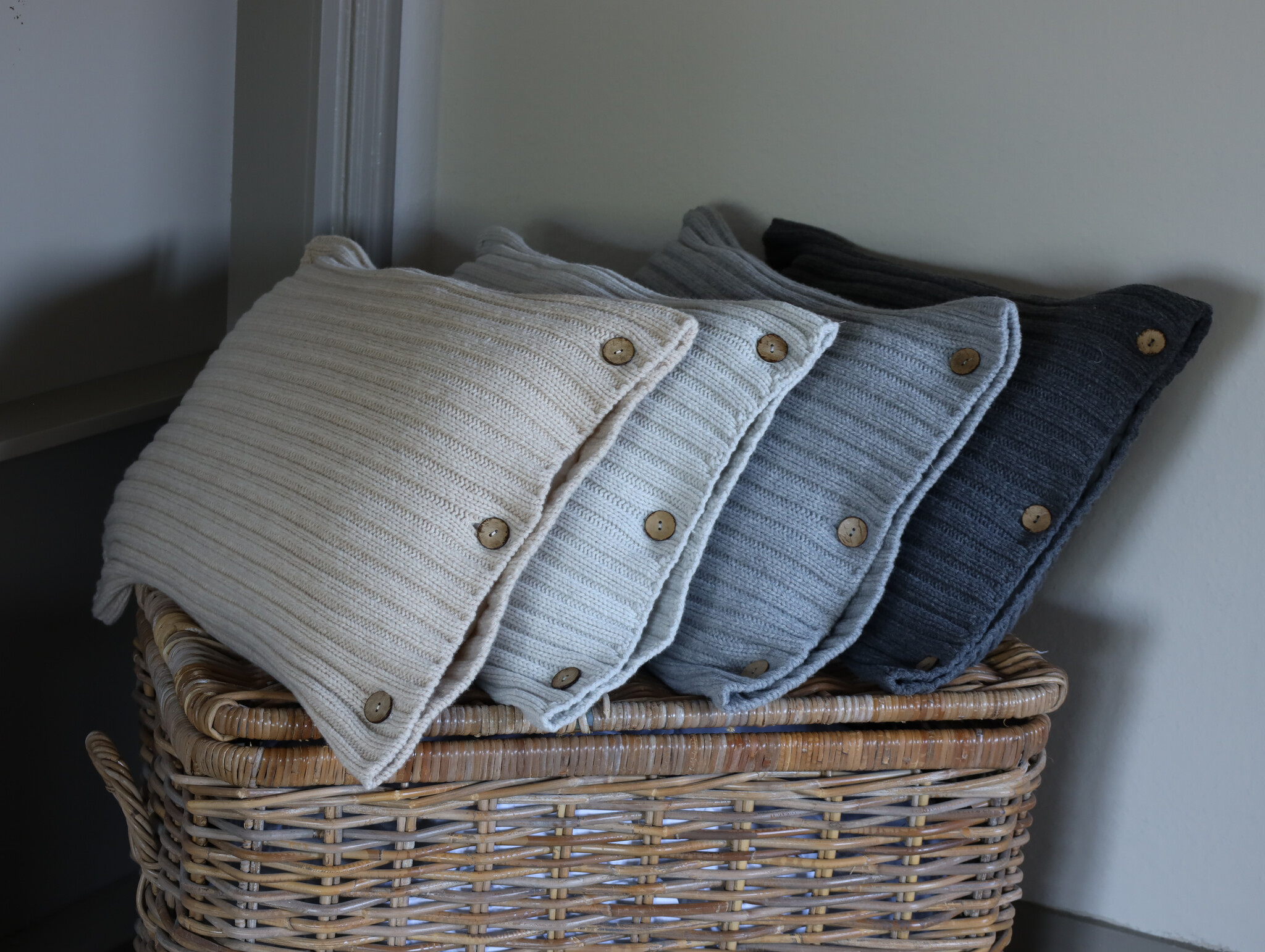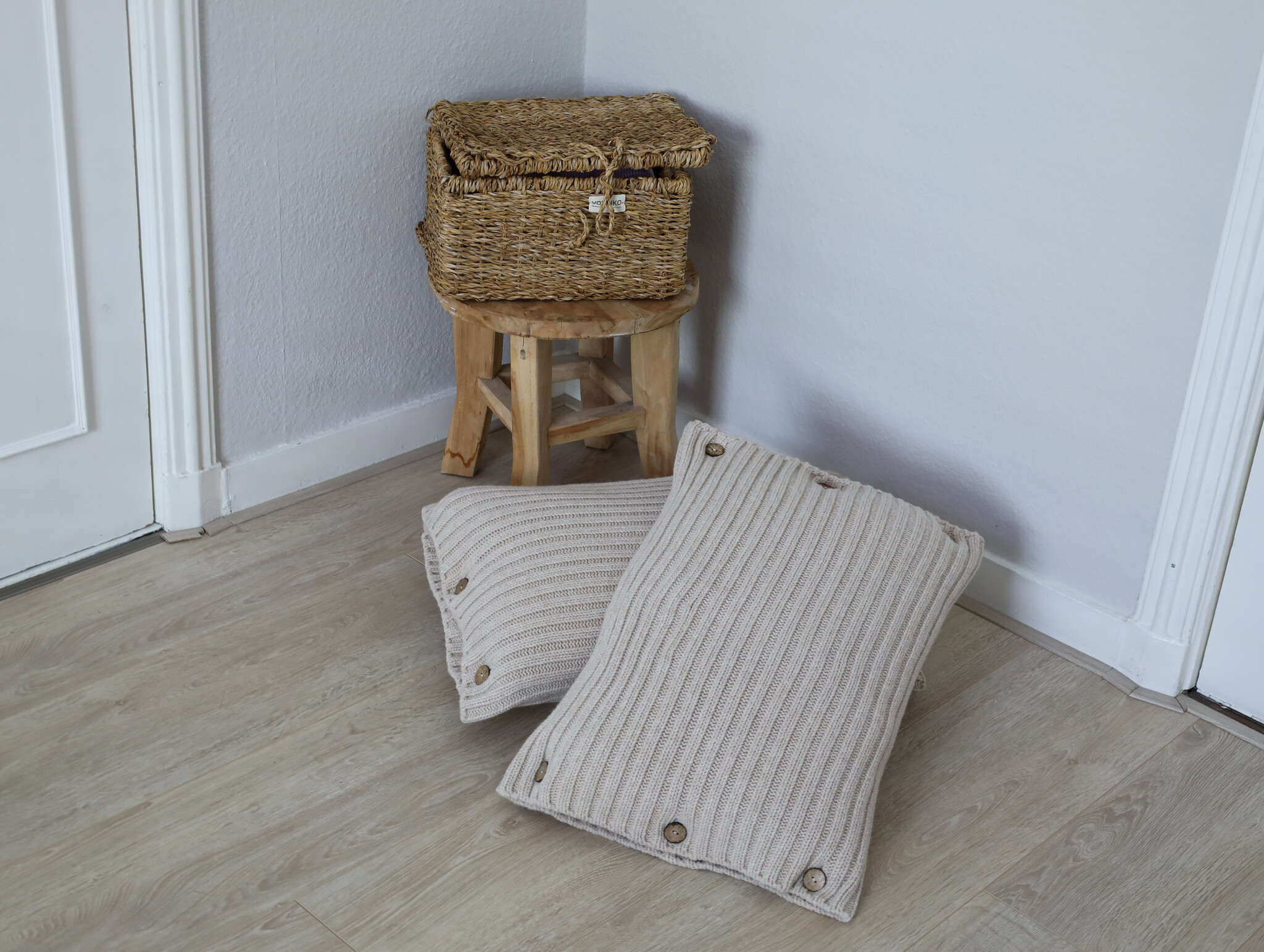 De wol zorgt voor een warme, ademende en zelfreinigende basis, terwijl de polyamide het materiaal extra sterk, vormvast en slijtvast maakt. De houten knopen aan de achterzijde geven het kussen een robuuste, ambachtelijke uitstraling.