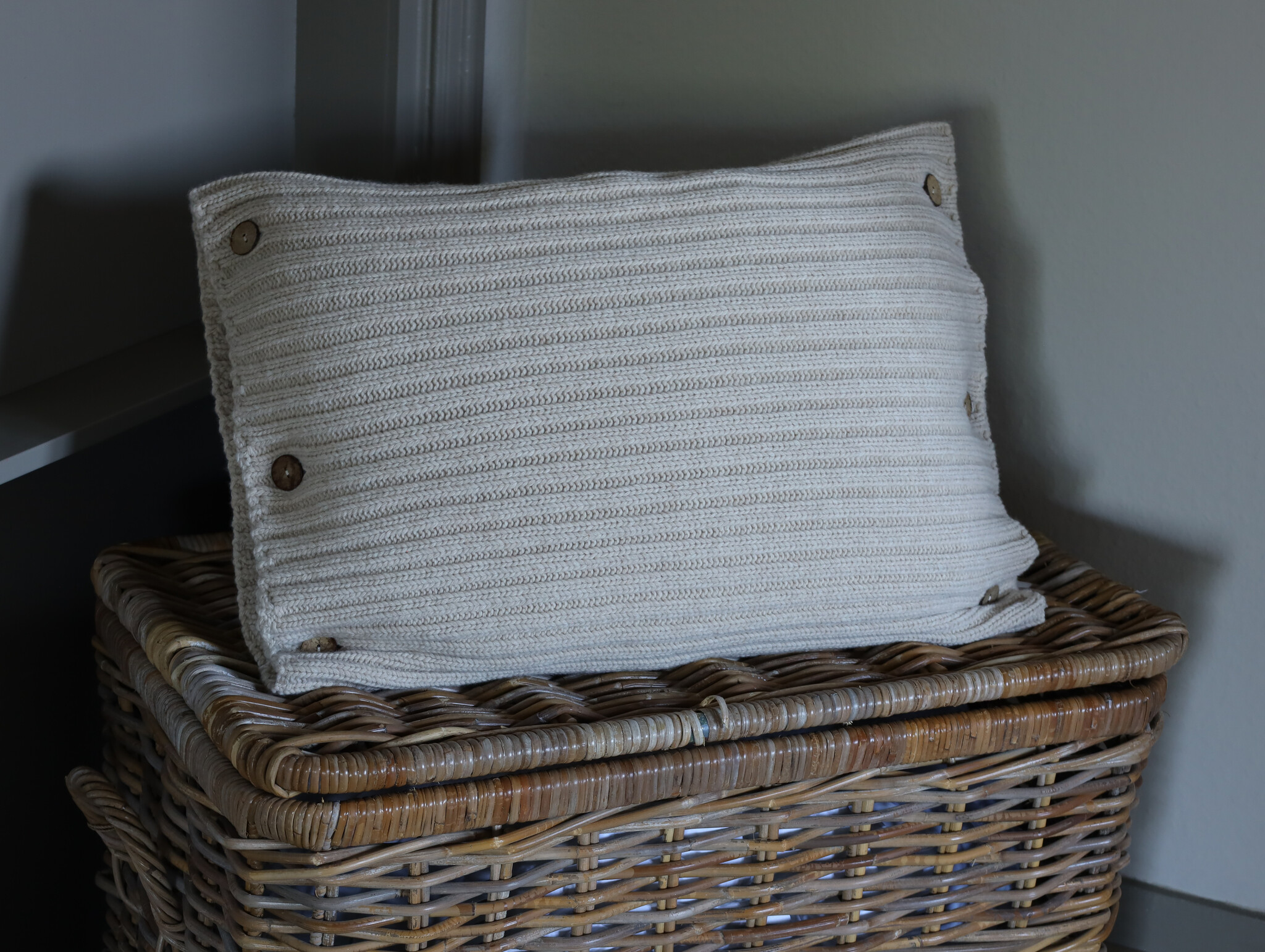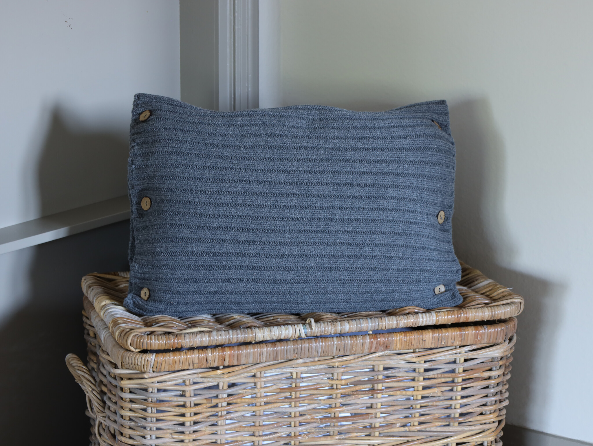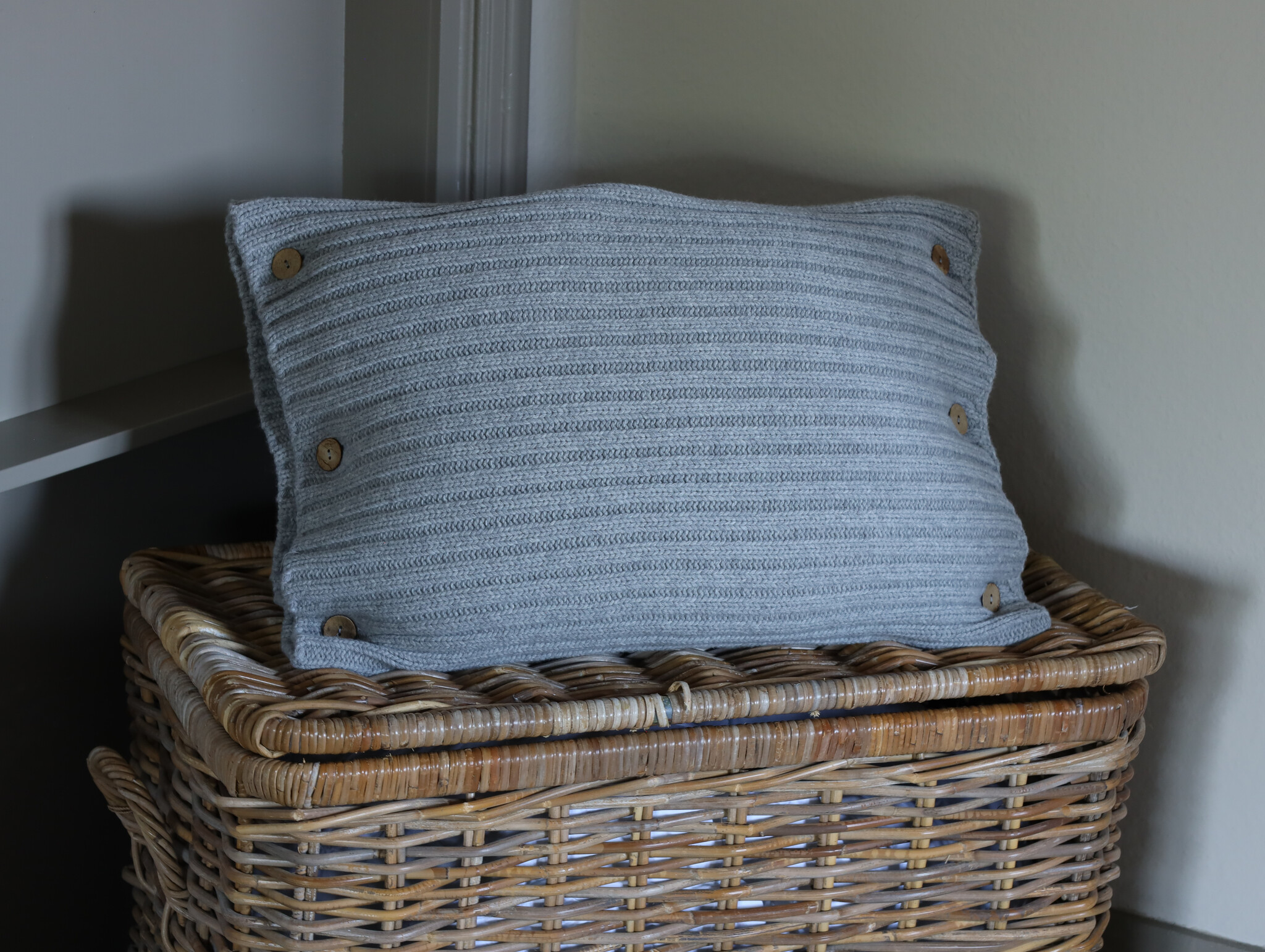 De wol zorgt voor een warme, ademende en zelfreinigende basis, terwijl de polyamide het materiaal extra sterk, vormvast en slijtvast maakt. De houten knopen aan de achterzijde geven het kussen een robuuste, ambachtelijke uitstraling.