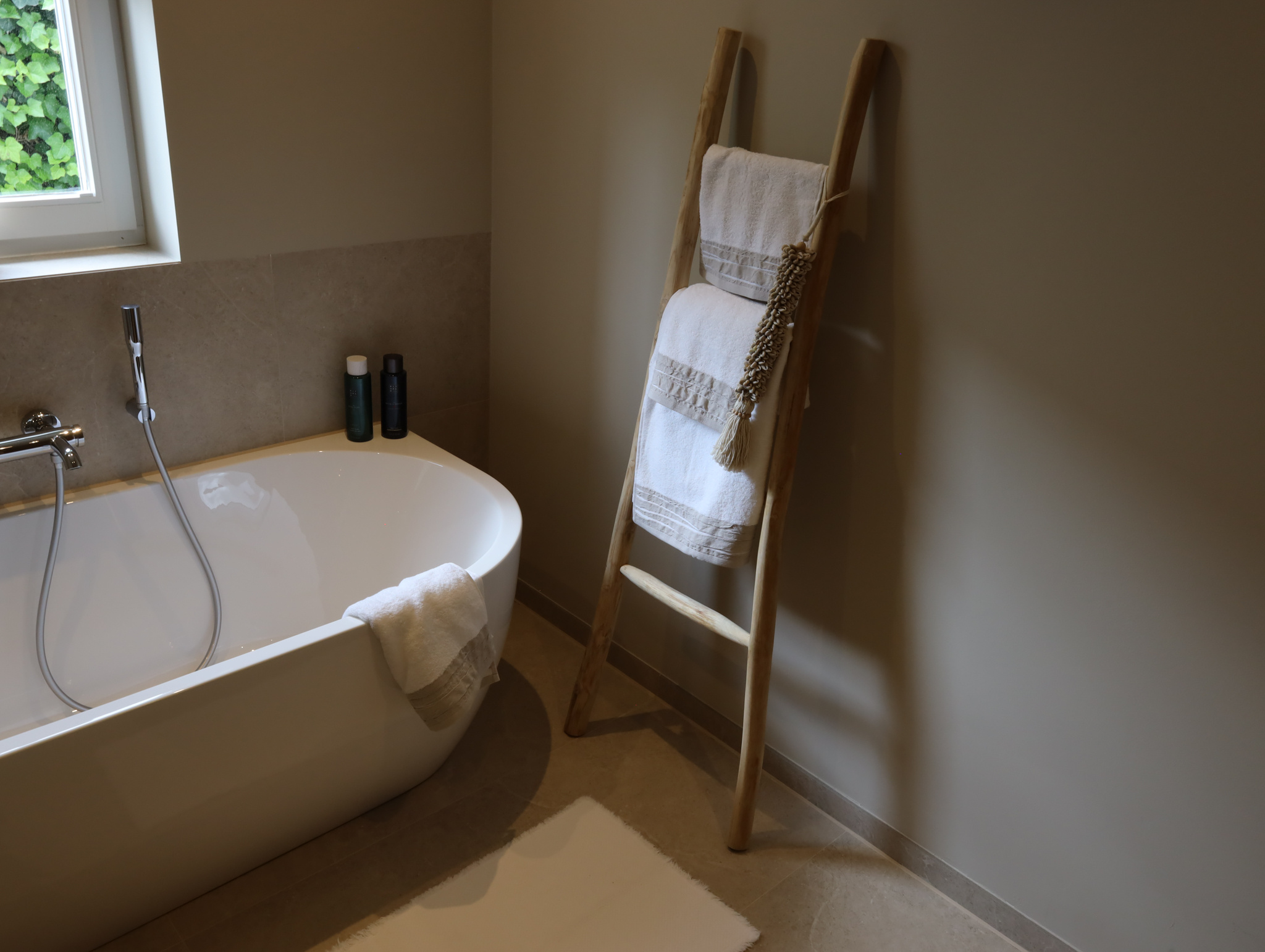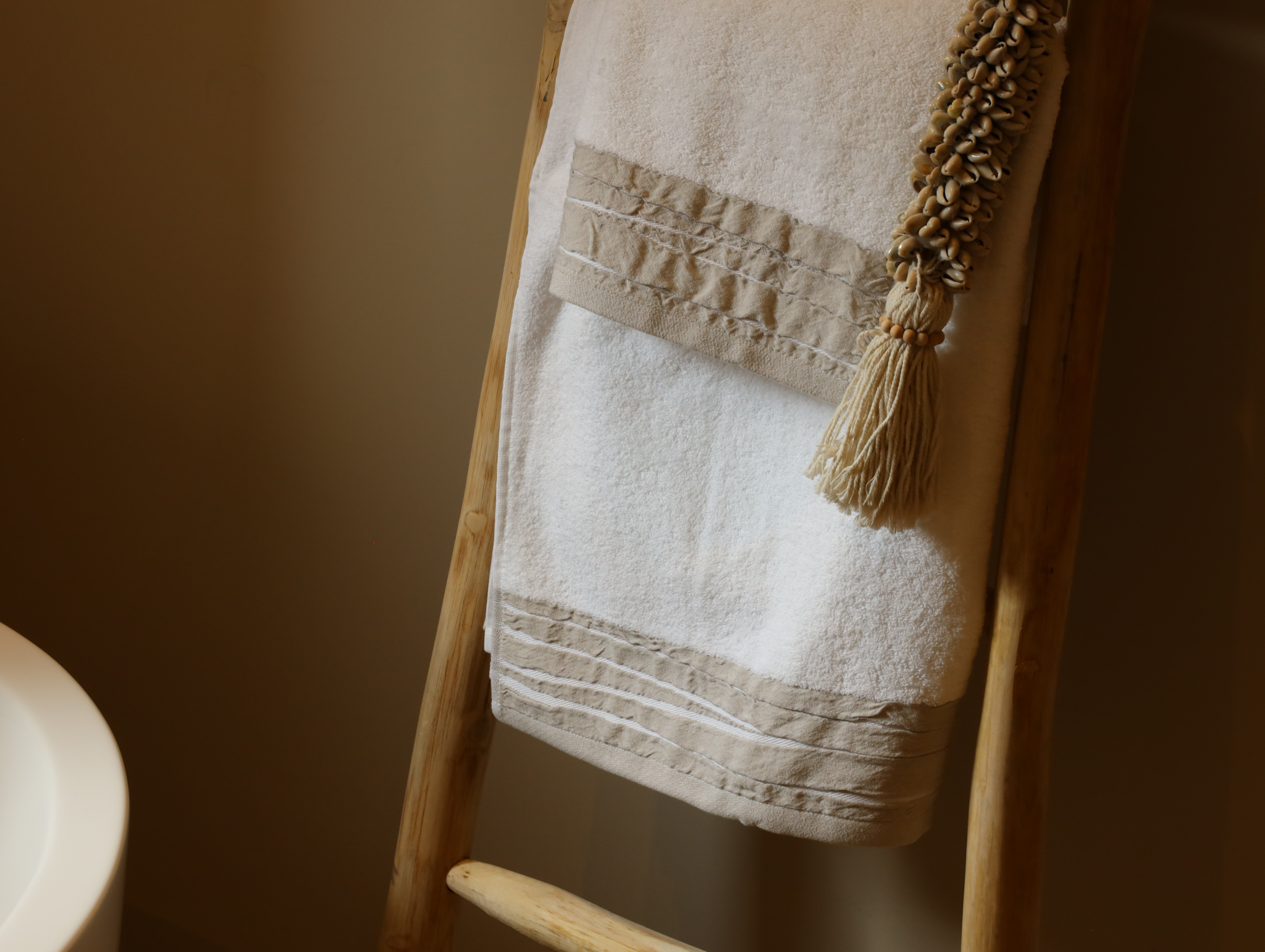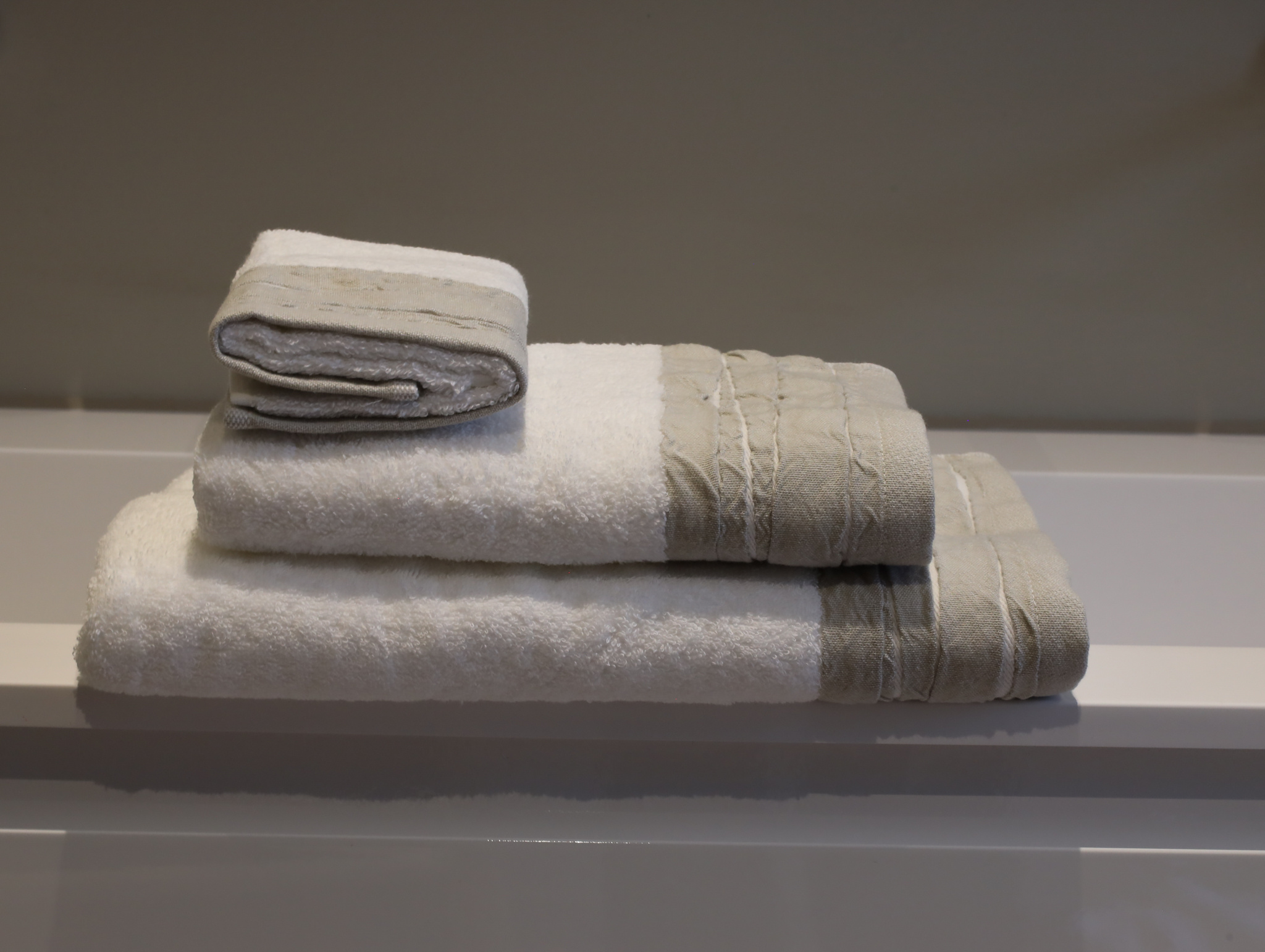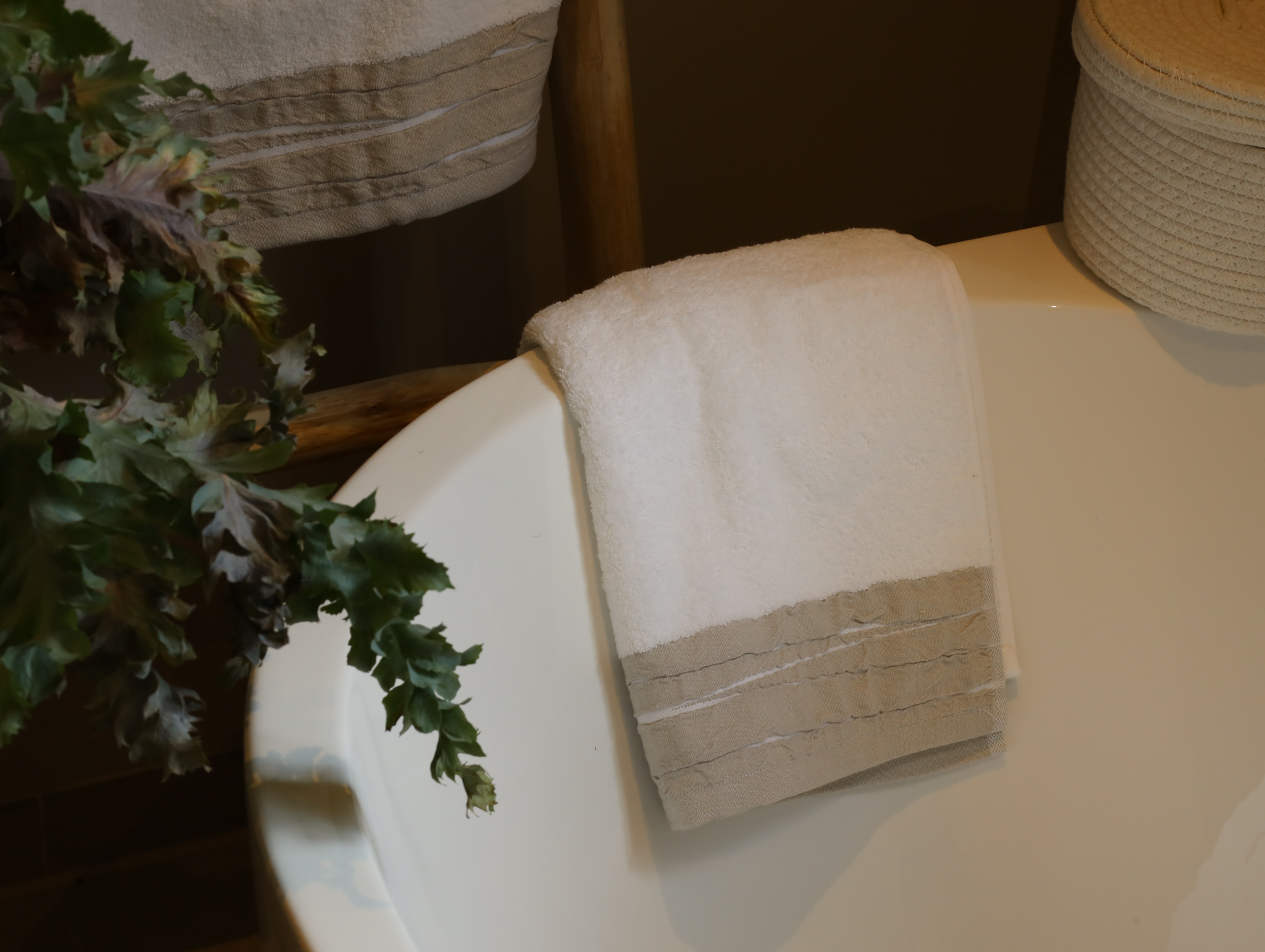 Deze luxe handdoek van 100% katoen (500 gsm) voelt heerlijk zacht en stevig aan. De elegante afwerking met een brede gefrotteerde rand in een subtiele linnenkleur geeft een moderne, natuurlijke uitstraling die in elke badkamer past.